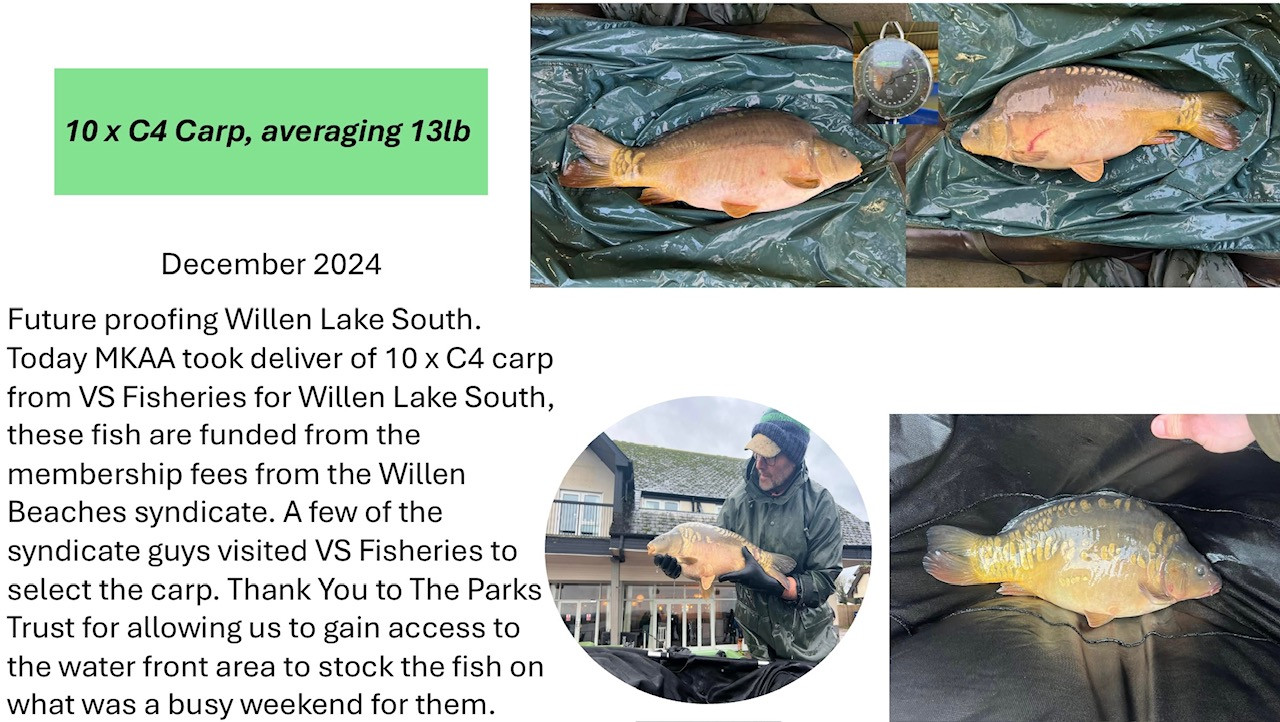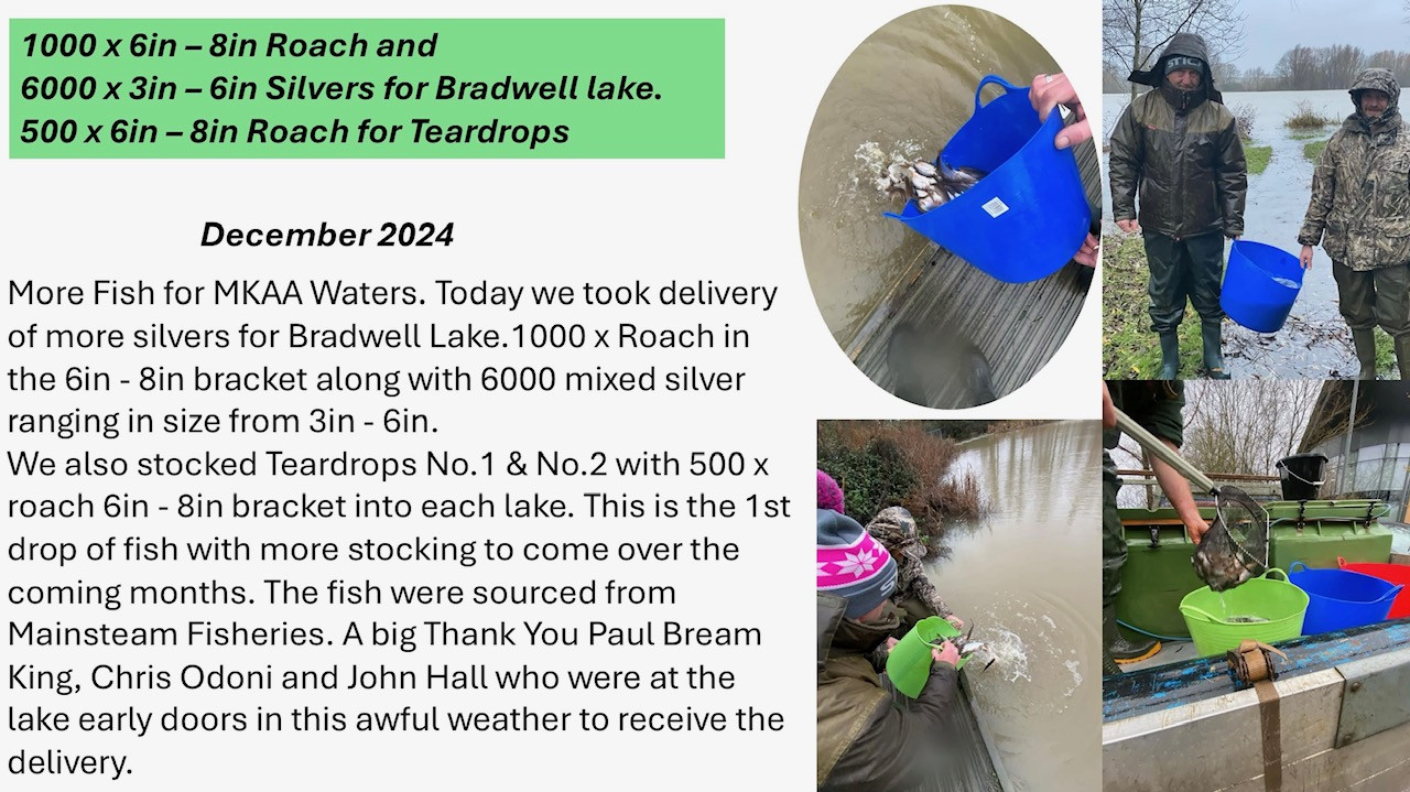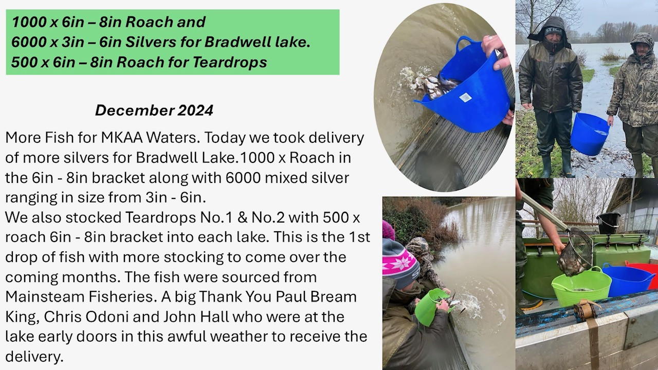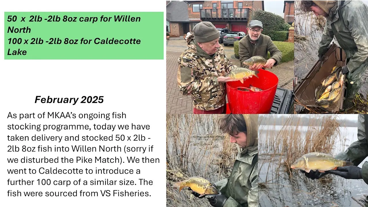 A year’s worth of fish stocking and over 30k spent on fish for MKAA Waters. A busy year and a real boost for many of our venues for now and thinking ahead for the future. We are committed to ensure our fisheries continue to offer excellent catches for our members regardless of whether you fish for silvers, carp or predators.